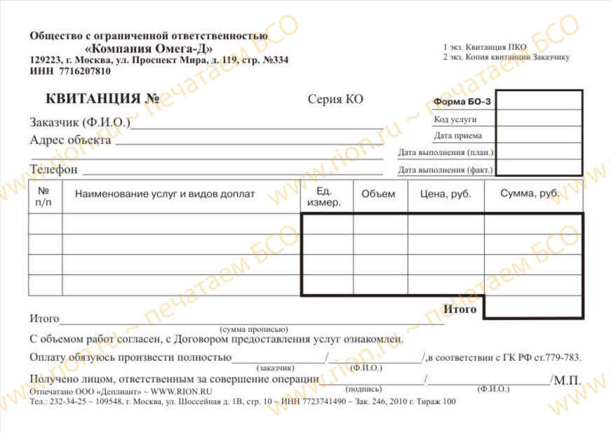 Бланк строгой отчетности - квитанция. Формат изделия использовался А6. Применялась двух слойная самокопирующаяся бумага. Печать осуществлялась черной краской, офсетом. На бланке была применена технология высокой печати для нумерации. Используется в работе организаций, оказывающих услуги ремонта и строительства.