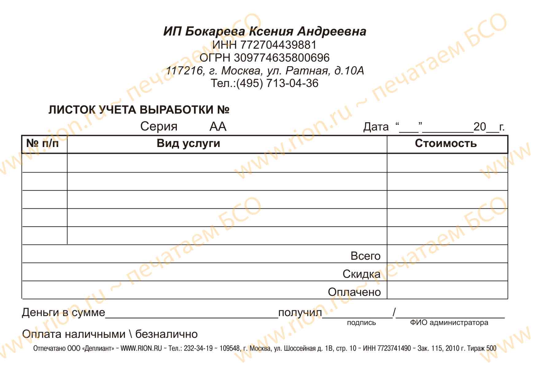 Вы можете заказать печать аналогичного бланка строгой отчетности, с изменениями, отвечающими требованиям вашей работы