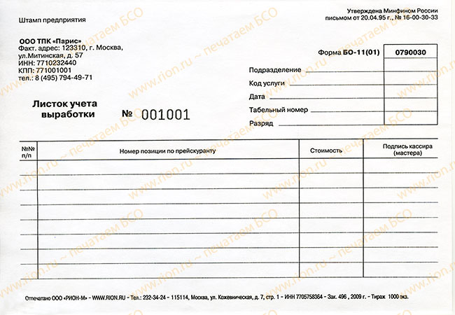 Образец бланка строгой отчетности, отпечатанного в нашей типографии.