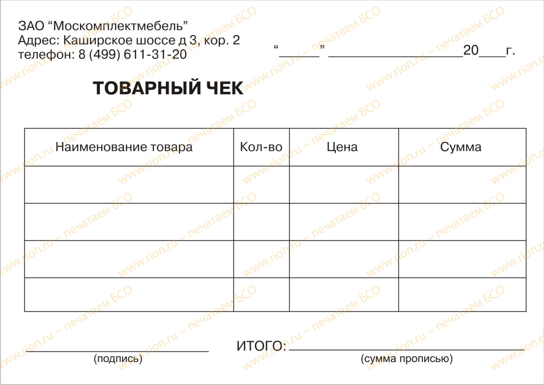 Бланк изготовлен на бумаге 65г/кв.м. Печать выполнена офсетной технологией в одну краску. Используется компанией, производящей мебель для расчетов за оказанные услуги без использования ККМ.
