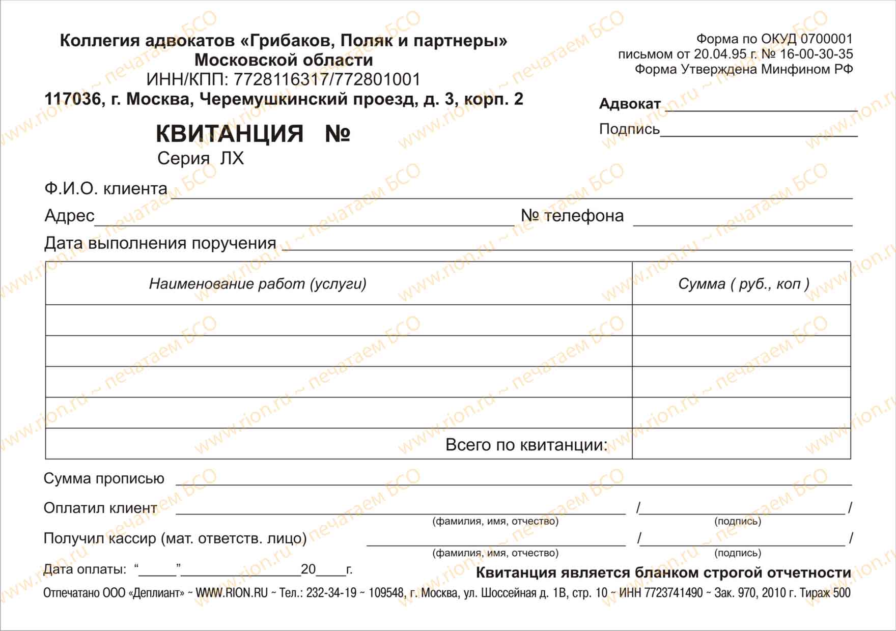 Квитанция выполнена на самокопирующейся бумаге методом офсетной печати, с применением шестизначной печати по технологии высокой печати. Бланк отпечатан форматом А6 (105х148 мм) и используется в повседневной деятельности адвокатов при расчетах за оказанные услуги.