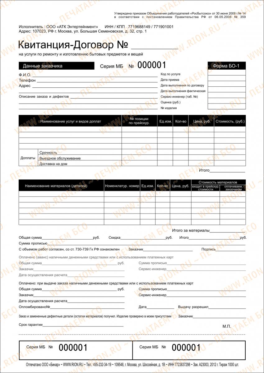 Квитанция на услуги по ремонту или изготовлению бытовых предметов размера А4 произведен из самокопирующейся бумаге в два слоя. Офсетная печать в одну краску. Шестизначный номер нанесен на все слои бланка. Область применения - оказание бытовых услуг населению. Бланк можно использовать в качестве БСО.