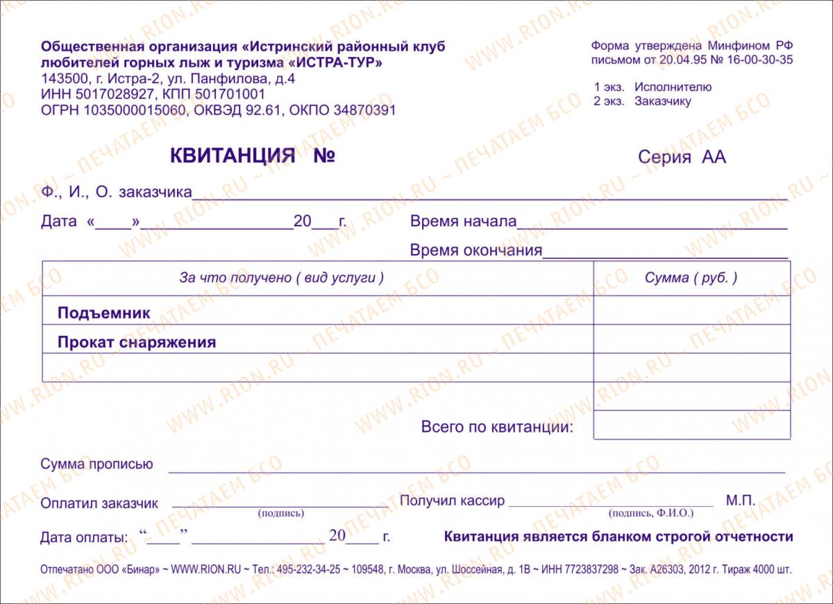 Квитанция клуба любителей лыж формата А6 отпечатана из самокопирующейся бумаги в два слоя. Печать выполнена офсетом темно синей краской краской. На бланк проставлена шестизначная нумерация. Область применения - клуб любителей лыжного спорта . Изделие соответствует требованиям предъявляемым к БСО.
