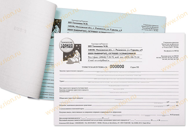 Бланк-путевка тур-1 имеет размер 210*145 мм., проклеена по короткой стороне и имеет 2-ва слоя. На квитанции имеются реквизиты, серия, номер, и логотип компании. В нижней части бланка напечатаны выходные данные типографии.
