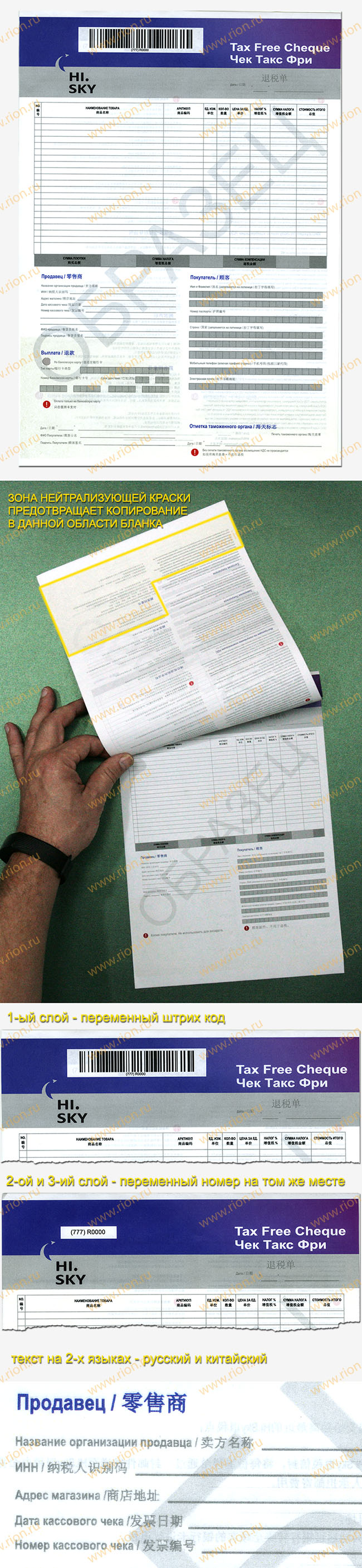 Размер 205х295мм. Данный чек Такс Фри изготовлен из трехслойной самокопирующейся бумаги белого цвета. Печать на первых двух слоях произведена с дух сторон 4+3 + положена выборочно нейтрализующая краска на первом и втором слое. Это сделано для того что бы при постановки даты и подписи на первом листе, они не копировались на последующие. Так как подпись должна быть оригинальной.